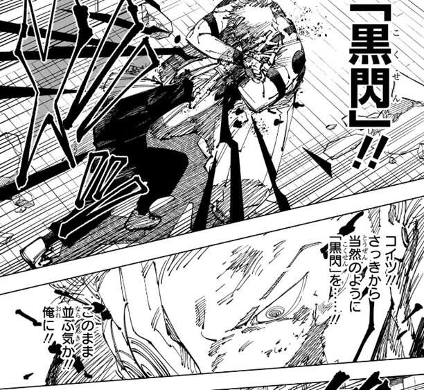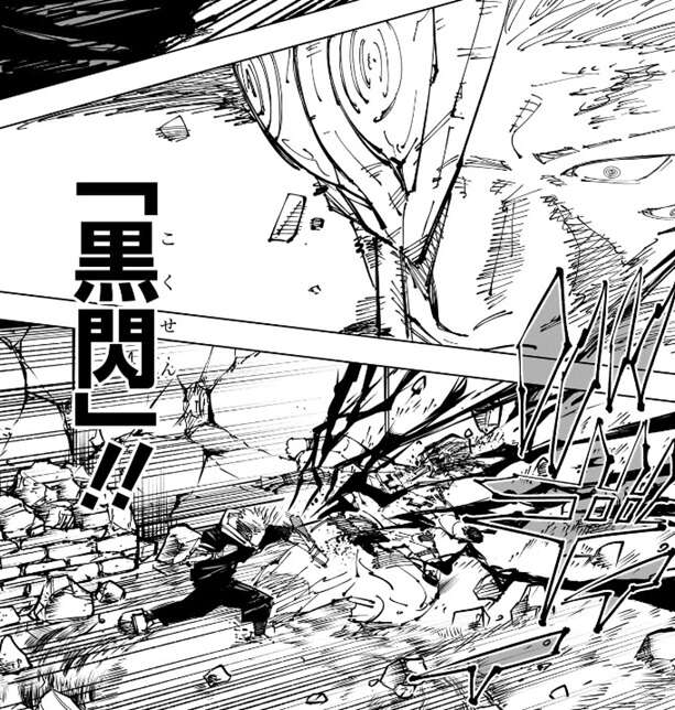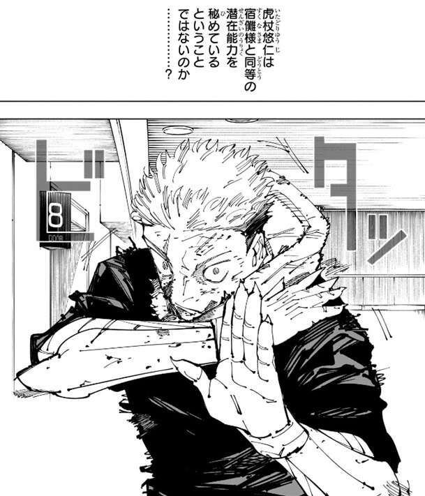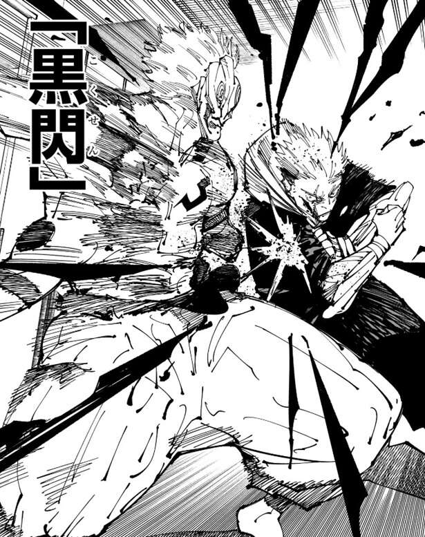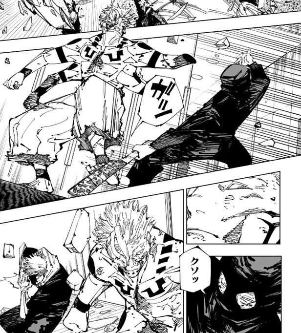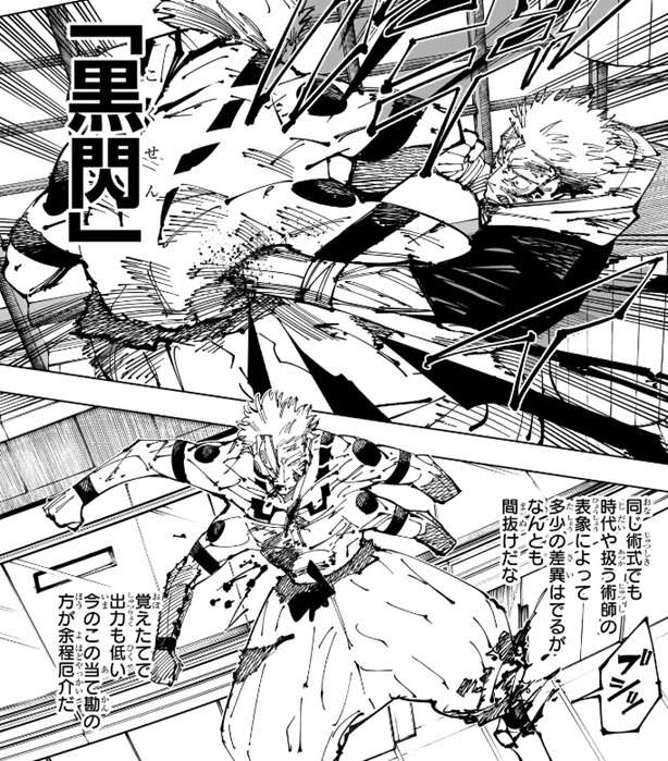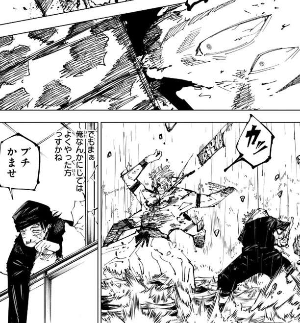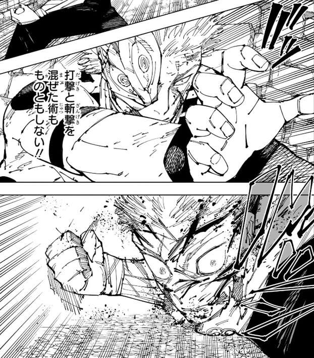 宿儺は投げ飛ばされた柱を斬撃でバラバラにすると、柱の残骸を虎杖の方に蹴って飛ばします。虎杖は宿儺の足を掴み、さらに宿儺を殴ろうとしますが、宿儺は斬撃を虎杖に飛ばし攻撃を阻止しようとします。しかし虎杖は飛んでくる斬撃を無視して、さらに打撃を加え宿儺に黒閃をきめます。宿儺は虎杖の斬撃を、なんとも間抜けだな、と表現し、覚えたてで出力も低く今のこの当て勘(黒閃の事?)の方が余程厄介だ、と心の中でつぶやきます。