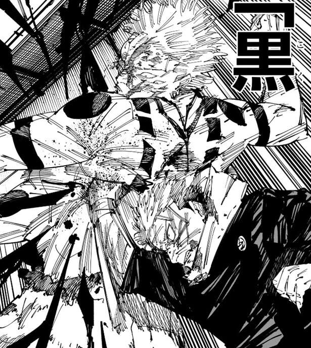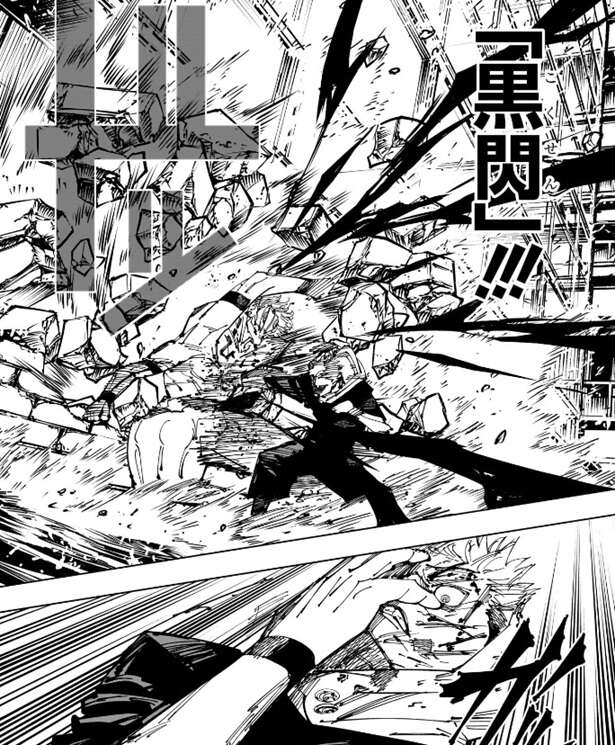 このパンチも黒閃となり、宿儺はパンチの衝撃で壁に押し付けられ、背後の壁が破壊されるほどの衝撃を受けます。