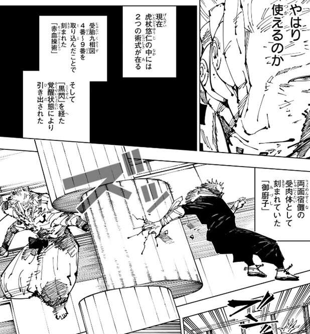 それでも宿儺は虎杖に反撃、虎杖を吹っ飛ばしますが、吹っ飛ばされた先で虎杖は柱に手を当てると、柱に切り取り線の模様が出てきます。ここで虎杖の術式に関して説明の記述が入ります。現在虎杖の中には2つの術式があり、1つは呪胎九相図4番~9番を取り込んだことで刻まれた「赤血操術」である事が明かされます。そしてもう1つが、第256話で「黒閃」を経て覚醒状態により引き出された、両面宿儺の受肉体として刻まれていた「御廚子」が虎杖の術式との事です。今、虎杖は「赤血操術」と「御廚子」の2つの術式を使える事が判明します。さらに虎杖が呪胎九相図4番~9番を喰っていた事も明かされます。第238話で虎杖が参戦した時、虎杖の腕と爪がおかしくなっている事に驚きましたが、これはおそらく呪胎九相図4番~9番を喰った影響なのでしょう。虎杖は「御廚子」の斬撃で柱を切断すると、それを宿儺に投げ飛ばします。