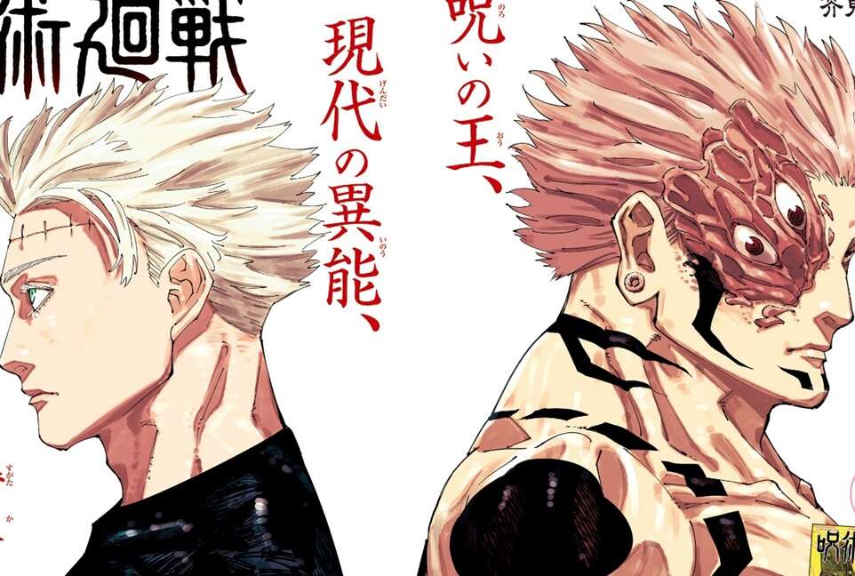 こちらが巻頭カラーです。呪いの王・両面宿儺と、現代の異能・乙骨憂太(肉体は五条悟)が背中合わせに立っています。