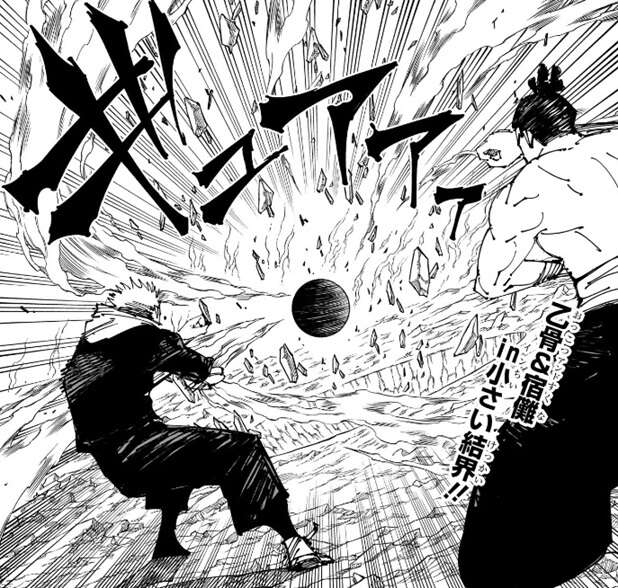 乙骨と宿儺は同時に領域展開を行い、結界を作り出します。この結界は第227話、228話で五条が宿儺の“結界を閉じない領域”に対して編み出した、「小さい結界」です。