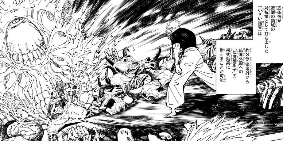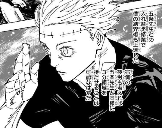 乙骨は五条と入れ替え修行をしていたようで、結界術も上達しています。その為、宿儺の疲労も考えれば五条と同様に、乙骨は3分領域を持たせることは可能なようです。対する宿儺も、「伏魔御廚子」の効果範囲を乙骨の領域の外殻を囲う程度にまで狭める事により、第258話ではあった時間制限99秒を取り払っています。