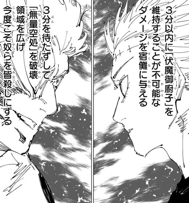 両者は3分という時間を意識します。乙骨は、「伏魔御廚子」を維持することが不可能なダメージを、3分以内に宿儺に与えようと考えます。一方、宿儺も3分を待たずして「無量空処」を破壊し、領域を広げ今度こそ皆殺しにしようと考えます。