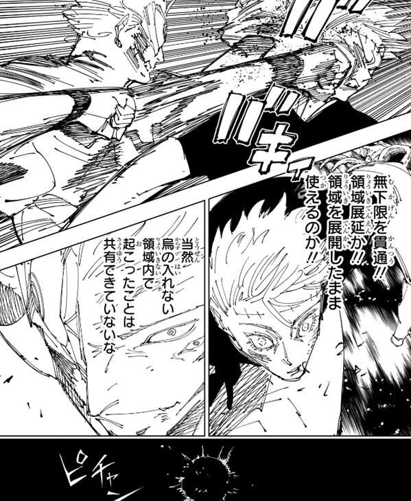 領域内では乙骨と宿儺が近接戦闘を始めます。乙骨は無下限呪術を使って宿儺を攻撃しようとしますが、宿儺は領域展延で術式・無下限呪術を中和し無下限を貫通、乙骨にパンチを浴びせます。烏の入れない領域内で起こった事は共有できていないので、乙骨は宿儺が領域を展開したまま領域展延を使える事を知らず、攻撃をくらってしまいます。するとここで突然、リカの泣き声が入ります。