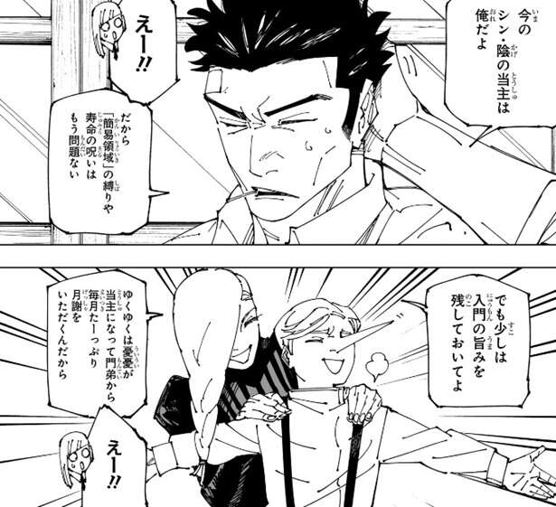 しかし日下部から衝撃の事実が明かされ、今のシン・陰の当主は日下部だそうです。日下部が「簡易領域」の縛りや寿命の呪いを無くしたので、もうシン・陰の縛りは問題ないとの事です。日下部が今の当主と知り、三輪が驚いています。さらに憂憂がゆくゆくは当主になる事も決定しているようで、少しは入門の旨みを残しておいてよ、と冥冥が日下部に言います。ゆくゆくは門弟から毎月たーっぷり月謝をいただくつもりのようで、これにも三輪は驚きます。