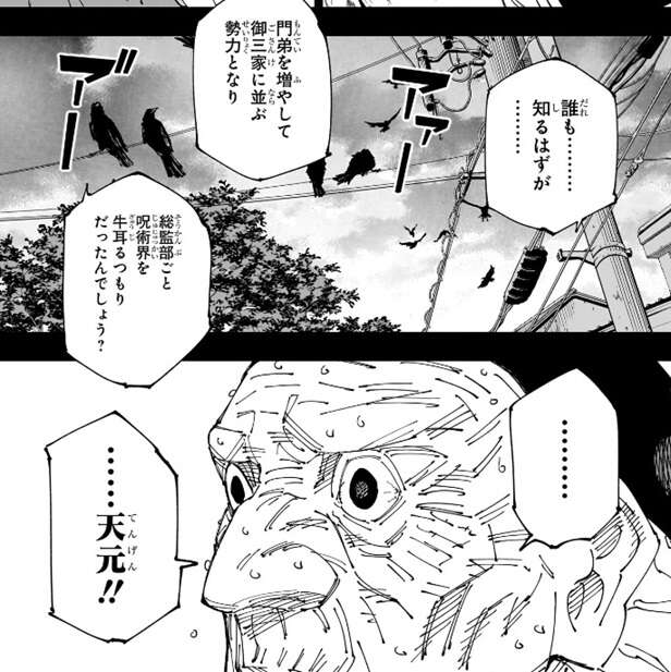 この駄菓子屋の店主が実は誰も知らなかった日下部の前のシン・陰の当主だったようで、当主自身も、誰も………知るはずが………、と冥冥が知っている事に驚きます。冥冥は知っている人に聞いただけと言い、門弟を増やして御三家に並ぶ勢力となり、総監部ごと呪術界を牛耳るつもりだったんでしょう?と、当主の野望を言い当てます。すると、当主は天元から情報が漏れたことに気付きます。