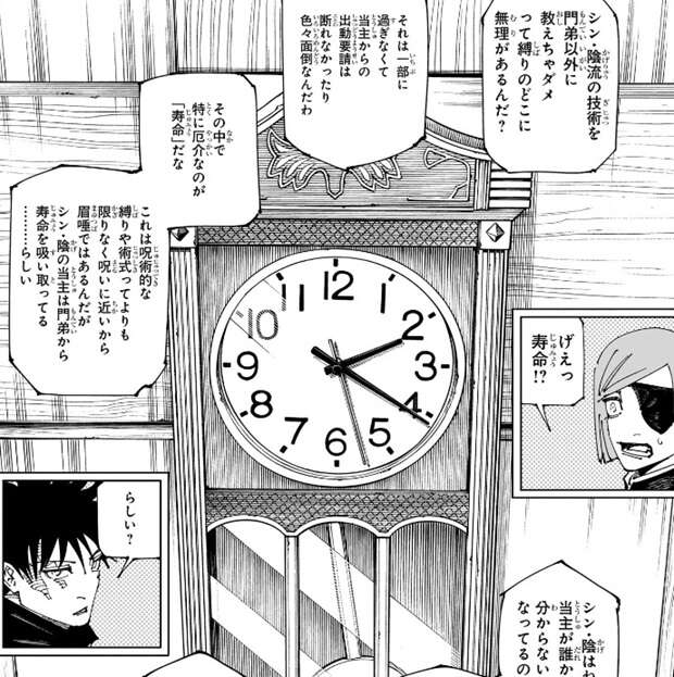 シン・陰流の縛りの中でも特に厄介なのが「寿命」だそうです。眉唾な話だそうですが、シン・陰の当主は門弟から寿命を吸い取っているらしいのですが、シン・陰は当主が誰か分からないようになっているので、寿命の契約が存在するが、どう履行されているかは分からないそうです。長生きしているジジババ門下生も存在するので、本当に寿命を吸い取っているのか真偽不明で、当主が死ねば高弟の中の誰かが当主になるが、本人が明かさない限り側から見抜くことは出来ないそうです。