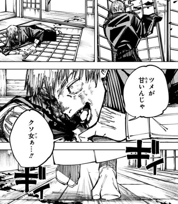 真希は高専忌庫から持ち出された呪具を回収するため、禪院家の忌庫を訪れますが五条悟開放を企てた謀反者として、父親の禪院扇に殺されそうになります。禪院扇は既に真依を半殺しにしており、真希は禪院扇を殺す決心をします。真希は呪具「竜骨」で襲い掛かり禪院扇の刀身を折りますが、禪院扇は呪力で刀身を補い真希の腹を切り裂きます。