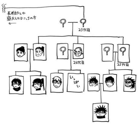 禪院家の家系図の一部です。禪院直毘人や扇の父親が23代目で、兄弟に25代目がいて、禪院直毘人は26代目です。25代目は甚爾や甚壱の父親のようですが、本編では未登場なので詳細不明です。伏黒は27代目当主になりますが、結局は禪院家が壊滅状態になってしまったので、当主の意味がほとんどなくなってしまいました…。
