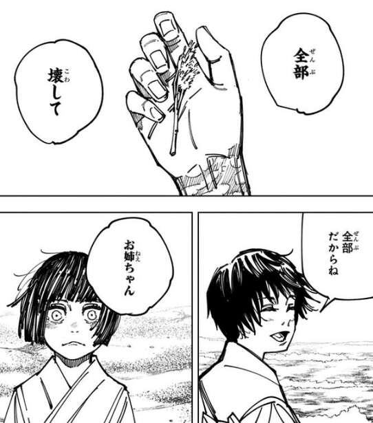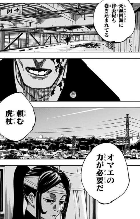 虎杖は伏黒から、さっさと高専に戻るぞ、と声をかけられますが、虎杖は渋谷での宿儺による大量殺人を自分のせいだと思い、今後どうするか迷っていました。しかし、伏黒から加茂憲倫が仕組んだ呪術を与えられた者たちの殺し合い“死滅回游”が起きた事、死滅回游に伏黒の姉・津美紀も巻き込まれている事を教えられます。