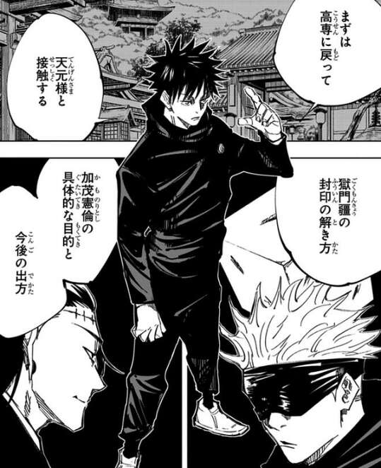 伏黒から虎杖の力が必要だと言われ、もし次俺が宿儺と代わったら迷わず殺してくれ、と虎杖は乙骨に頼んだうえで伏黒に協力する事を了解します。まず伏黒達は高専に戻り天元と接触し、五条を封印している獄門疆の封印の解き方と、加茂憲倫の具体的な目的と今後の出方を尋ねることにします。