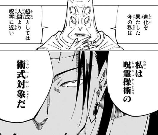 薨星宮で天元と接触できた虎杖達は、加茂憲倫の正体が羂索だと知らされます。さらに、羂索の目的は日本全土を対象とした人類への進化の強制で、具体的な進化の手段は人類と天元との同化だと、天元から教えてもらいます。12年前に進化を始めた天元は、星漿体以外との同化もできなくもない状態でした。、さらに天元の組成は人間よりも呪霊に近く、羂索の呪霊操術の術式対象の為に取り込まれてしまうかもしれない、と天元は虎杖達に警告します。