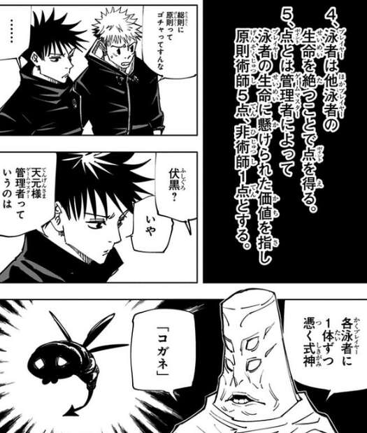 獄門疆に封印された五条を開放するには、死滅回游に参加しているプレイヤー来栖華の術式が必要だと知らされます。来栖華の術式は、あらゆる術式を消滅させる術式で、東京の東側のコロニーにいると天元から聞かされます。死滅回游のルールを一通り確認した虎杖達は、それぞれの役割に沿って行動を開始します。