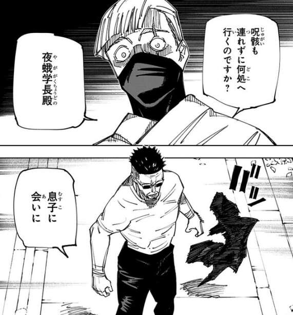 都立呪術高専の学長・夜蛾正道がパンダを造った時と、渋谷事変後のお話です。渋谷事変後、パンダは夜蛾を誘い出すために上層部に捕まってましたが、日下部の手助けで何とか脱出に成功します。一方、夜蛾正道はパンダを助けに行こうとしますが、追っ手に行く手を阻まれてしまいます。追っ手は完全自立型人工呪骸の製造方法を明かすように、夜蛾正道に迫ります。