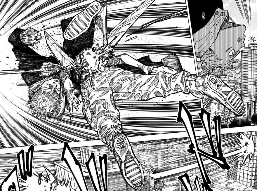 東京第1結界に侵入した虎杖と伏黒は、設定された地点にランダムに転送されて、侵入そうそう離れ離れになります。虎杖は高層ビルの上空に転送され、そこに初心者狩りのプレイヤーが現れいきなり体当たり攻撃をくらいます。虎杖は体当たりしてきたプレイヤーを簡単に撃退しますが、さらに初心者狩りプレイヤーの仲間が現れます。