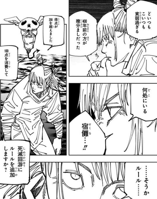 秤金次の説得に成功した虎杖達は、早速各々が出向く結界の割り振りを考えようとしますが、突然コガネが総則9のルール追加をアナウンスします。プレイヤーは他プレイヤーの情報を参照できるというルールが追加され、虎杖達はコガネからプレイヤーの情報を参照することが出来るようになります。