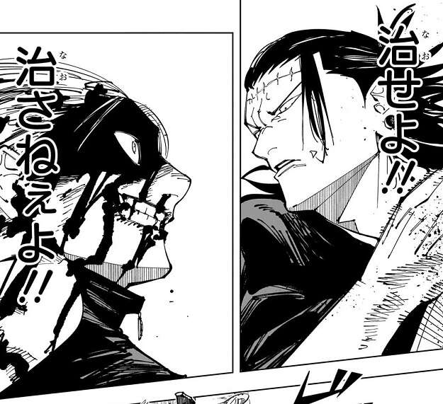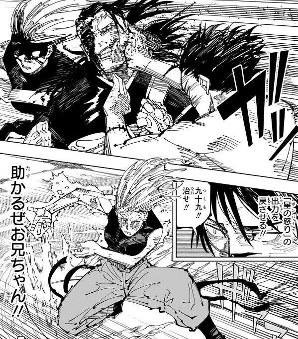 傷を治癒せず羂索を攻撃していた九十九ですが、すぐに限界がきて動けなくなってしまいます。九十九に限界が来たと油断する羂索ですが、その隙をついて一度敗れて退場した脹相が再び参戦し、穿血で羂索を攻撃します。この穿血は自分の頭蓋をスリッピングアウィーの要領で回転させて受け流しますが、九十九と脹相は羂索に何度か攻撃を当ててダメージを与えます。そして脹相が羂索に攻撃している間に、九十九は反転術式で自分の傷を治癒します。