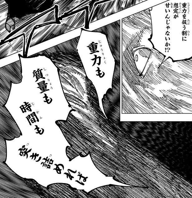 天元が今更羂索の前に姿を現したのは羂索の気を逸らせる為で、九十九は“星の怒り(ボンバイエ)”で自らに付与している仮想の質量を後付けで増やし続けます。その質量はブラックホールが発生するほどで、九十九は羂索を巻き込んでブラックホールで自爆を図ります。
