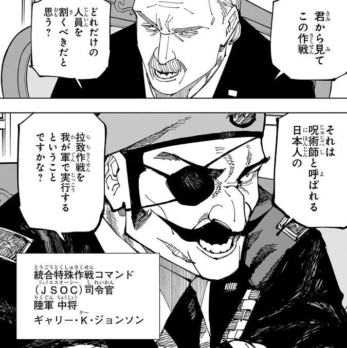 2018年9月、羂索は渋谷事変が起こった日本で日本国民(呪術師)を拉致するように、アメリカ大統領に提案していました。アメリカ大統領は否定的な態度を示しますが、環境担当次官・サイラスは“呪術師”という資源を研究すればエネルギーの自給自足が実現する、と言い、“拉致”を“保護”と言い換えてアメリカ大統領に羂索の提案を実行するように迫ります。アメリカ大統領は羂索が他国と手を組む可能性も考慮し、呪術師の拉致作戦を決意し統合特殊作戦コマンド(JSOC)司令官のギャリー中将にアドバイスを求めます。