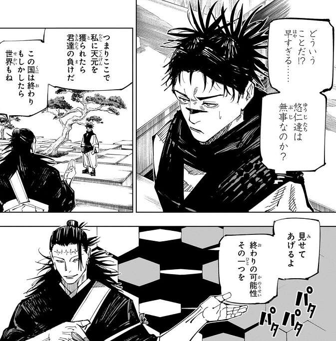 天元と九十九は、12年前の天内理子との同化に失敗した、その後のことについて会話をしていました。その会話の中で九十九由基が元・星漿体である事が判明します。そして、天元と九十九が同化についての会話をしていると、薨星宮直上に羂索が現れます。羂索は結界を破って薨星宮に侵入しますが、そこには脹相がいて羂索を迎え撃とうとしていました。羂索は既に死滅回游は役割を終え、同化前の慣らしが済んだことを脹相に告げます。そして羂索は、見せてあげるよ、終わりの可能性その一つを、と言うと、天元と日本の非術師の同化がどうなるかをスクリーンのようなものに映し出します。