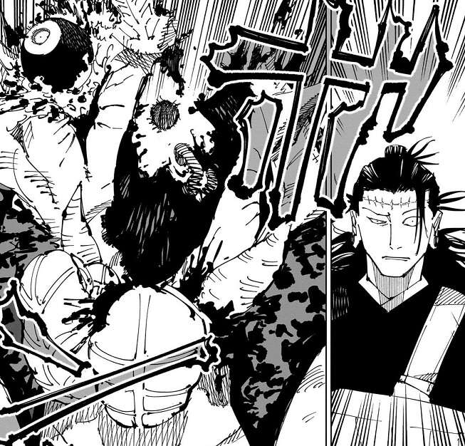 脹相が羂索に呪霊操術以外の何らかの術式を使わせたところで、九十九が参戦します。脹相は力尽きて結界から退場していき、九十九と羂索の一騎打ちが始まります。羂索は“あらゆる障害”取り除くという特級呪霊を使って九十九を攻撃しようとしますが、九十九は“凰輪(ガルダ)”と呼ぶ自身の式神を使って攻撃、特級呪霊を一撃で撃破します。さらに九十九は、自らに仮想の質量を付与する術式・“星の怒り(ボンバイエ)”を使って羂索を直接殴り、空性結界の外まで吹っ飛ばします。