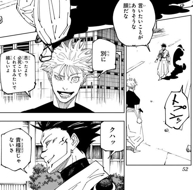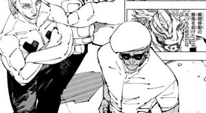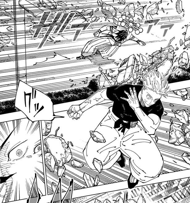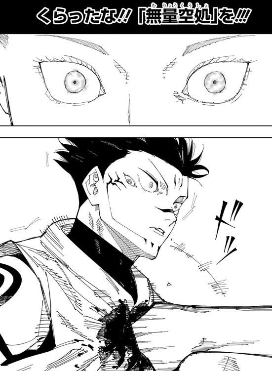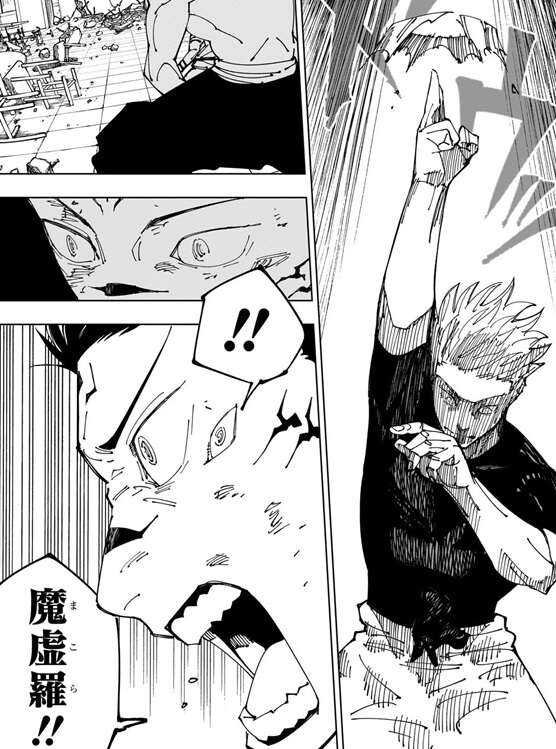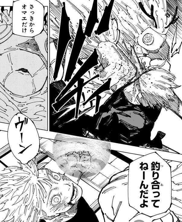 3対1と五条が不利な状況となり、乙骨は自分も参戦して宿儺の式神2体を引き受けようとしますが、日下部達に止められます。五条と戦った後も乙骨や真希など高専メンバーと戦う必要のある宿儺は全てを出し切るわけにはいかず、足手纏いなしの全力の五条を当てるのが一番勝率が高いと、日下部に言われ乙骨は渋々五条を助けに行くのを止めます。一方、戦いの場では五条が二度目の黒閃を決めますが、魔虚羅が宿儺のように斬撃を飛ばし、五条は右腕を斬り飛ばされます。右腕を失った五条に宿儺、魔虚羅、顎吐の三者は連携して一気に畳みかけますが、顎吐に対してオマエだけ釣り合ってないと五条は言うと、無下限呪術に適応していない顎吐に無下限呪術を応用した拳を浴びせます。