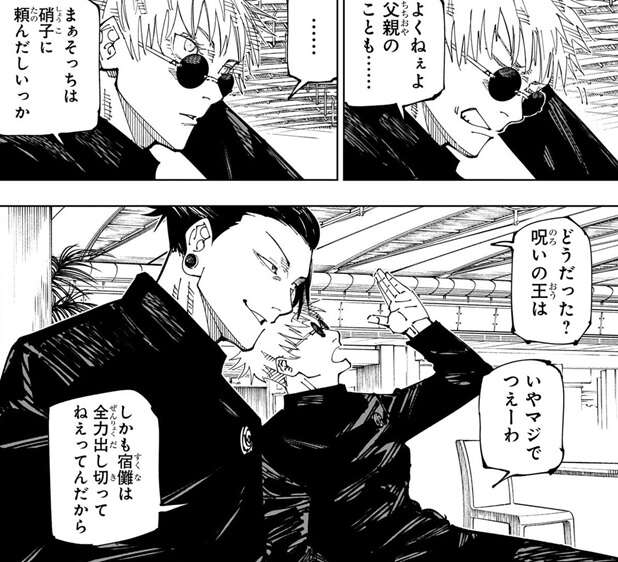 五条は死んだ後の世界?のような場所で、既に死んでいる夏油傑、七海建人、灰原雄、夜蛾正道達と再会し、宿儺に自分の鍛えた肉体、身に付けた技術、磨き上げたセンスや場当たりの発想と瞬発力、全てをぶつけられて楽しかったと彼らに語ります。一方、宿儺は五条本人も認めている通り、五条に全てをぶつけたわけではなさそうで奥の手を残していそうですが、それでも五条を認めて、天晴れだ五条悟、生涯貴様を忘れることはないだろう、と五条を称賛します。
