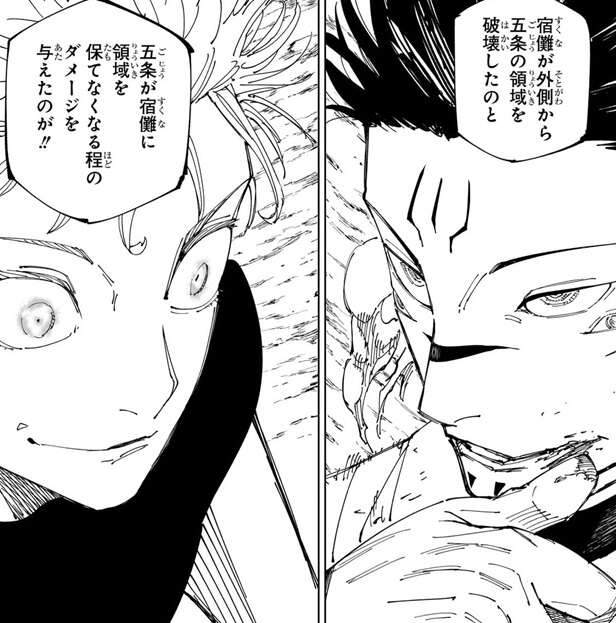 五条は領域の要件を変更し領域の結界の強度を上げて、宿儺に領域を破られないように対抗します。一方、宿儺も領域の効果範囲をより絞って術式の出力を上げて、五条の領域を破ろうとします。この領域の押し合いは、宿儺が外側から五条の領域を破壊するのと同時に、五条も宿儺が領域を保てなくなるほどダメージを与えて宿儺の領域を破壊し、相打ちの形になります。