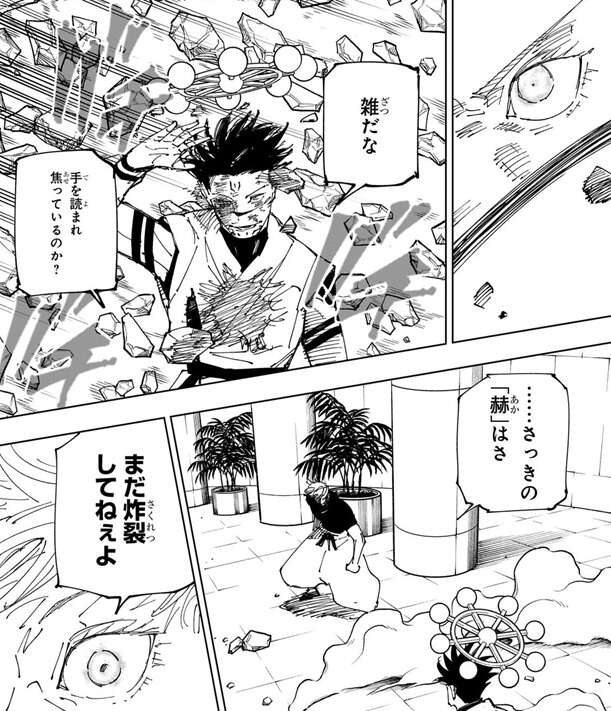 魔虚羅の適応を避けて、五条は順転「蒼」しか使いませんが、魔虚羅は無下限呪術の順転への適応を着々と進めていきます。あと1回、適応すれば魔虚羅が無下限呪術の順転への適応を終えるといったタイミングで、五条はこれまで使ってこなかった反転「赫」で一気に畳みかけようとします。