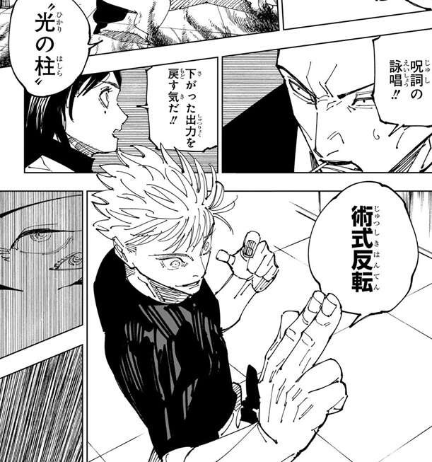 二度の黒閃を決めて五条のボルテージが上がり、反転術式の出力も戻り、斬り飛ばされた右腕を一瞬で治療します。さらに五条は反転「赫」を放ち、顎吐を圧殺させた順転「蒼」にぶつけて、虚式「茈」を発生させようとします。