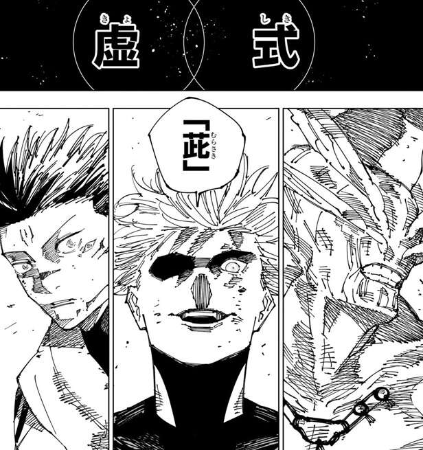 五条も宿儺も二人とも脳にダメージを蓄積してしまい、領域展開を使用できなくなってしまいます。領域が使えなくなった二人は近接戦闘に移り、五条は無下限呪術の順転「蒼」や反転「赫」に魔虚羅が適応する前に、宿儺を殺そうとします。しかし、魔虚羅の無下限呪術の順転への適応は既に始まっており、魔虚羅が僕の不可侵に適応するまでの法陣の回転数はトータル4回だろ、と五条は宿儺にかまをかけます。