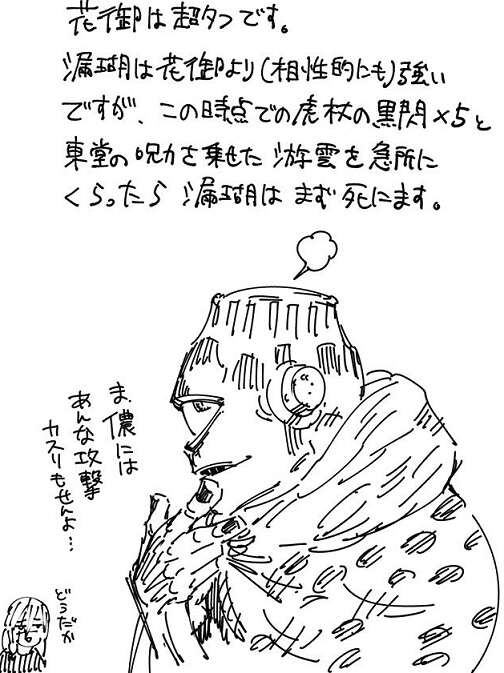 花御は交流会編で虎杖に黒閃を5発 連続でキメられていて、さらに東堂の呪力を乗せた游雲の攻撃も急所にくらっていますが耐えきって、その後は“供花”で反撃しようとするぐらいの超タフさです。漏瑚だと同じ攻撃をくらったら、死んでしまっていたそうです。