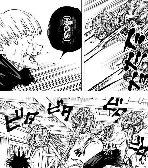 伏黒と真希の共闘で花御にダメージを与えますが、伏黒は花御に芽を打ち込まれてしまい、術を使うことが出来なくなってしまいます。ダメージを負った真希も花御に捕まり、絶体絶命となりますが、そこに虎杖・東堂葵のコンビが現れます。