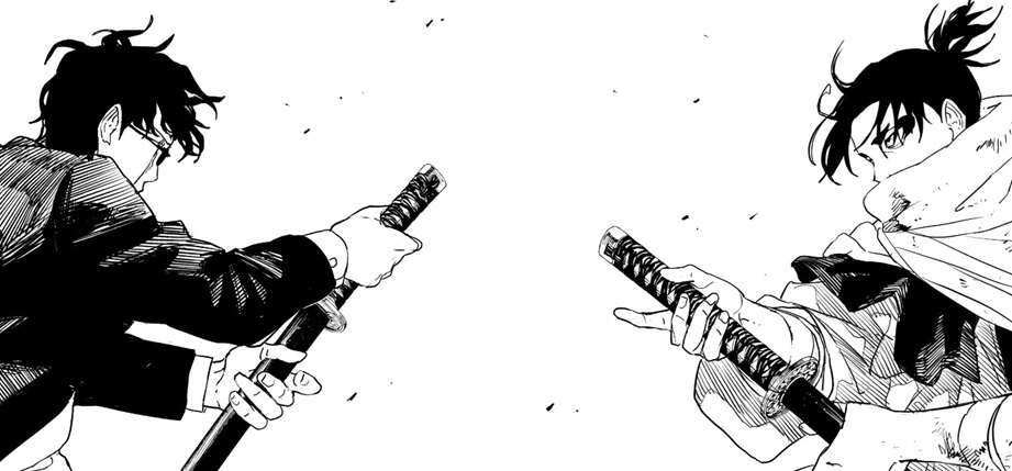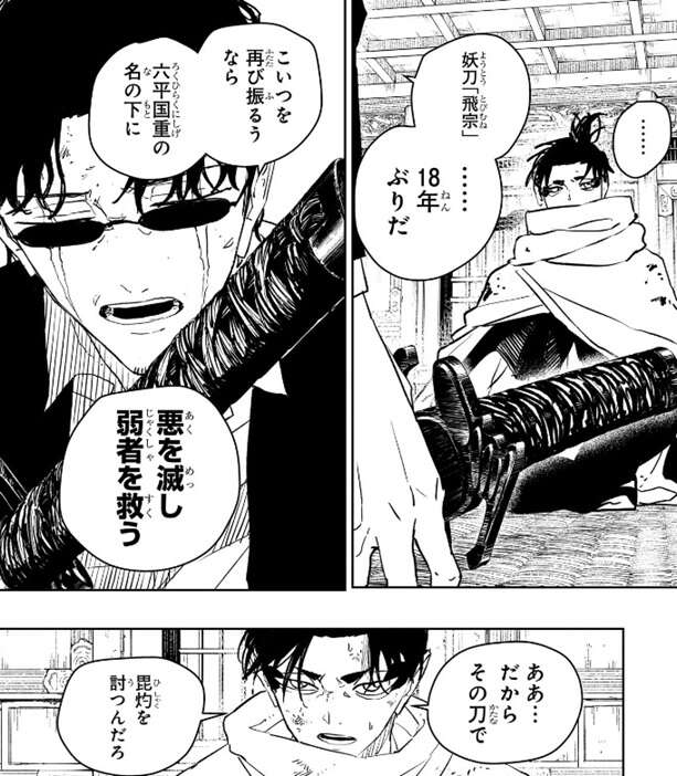 座村は妖刀「飛宗」を18年ぶりに振るうなら、六平国重の名の下に悪を滅し弱者を救う、と断言しますが、漆羽は、ああ…、だからその刀で毘灼を討つんだろ、と答えます。