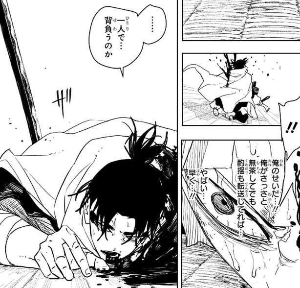 座村は普通の刀から飛宗に変えると、漆羽に止めを刺そうとします。一方、ハクリはさっさと無茶してでも酌揺を転送していれば漆羽は死ななかった、俺のせいだ、と自分を責めチヒロを早く転送しようとします。座村に飛宗で斬られそうになった漆羽は、一人で…背負うのか、と座村に問いかけます。