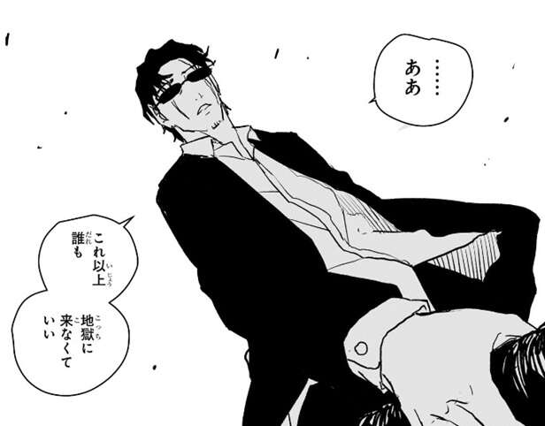 ……ああ、これ以上誰も地獄(こっち)に来なくていい、と座村は答えると、飛宗で漆羽を斬り殺します。それと同時に、チヒロが転送されてきます。