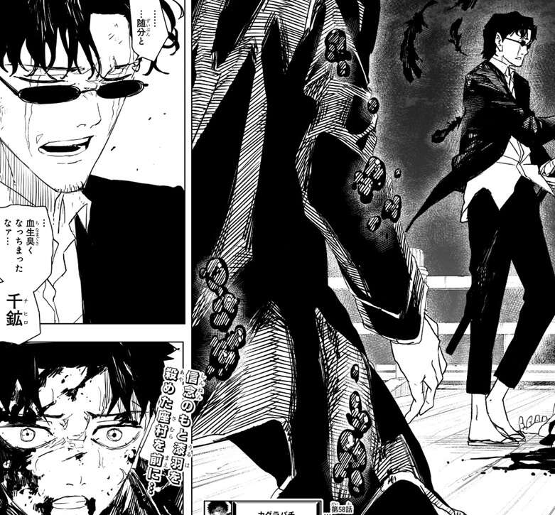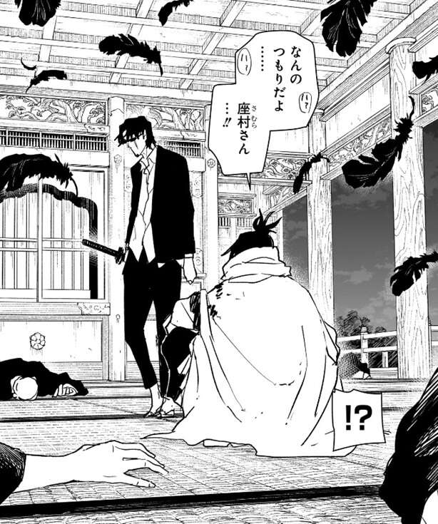 そこには鳥の羽が舞う中、漆羽を殺した直後の座村が立っていました。最悪の状況で数年ぶりに座村と再会したチヒロ。一方、血まみれのチヒロを見て、………随分と、…血生臭くなっちまったなァ…、千鉱、と座村はチヒロに話しかけます。