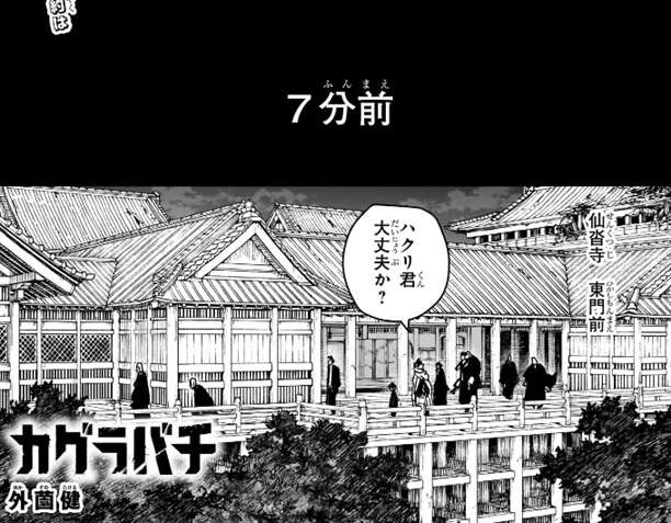 昼彦には抜けないはずの酌揺(くめゆり)を、昼彦が抜いて使用する7分前の出来事です。仙沓寺 東門前をハクリを背負った巻墨、それに座村や漆羽たちが移動しています。