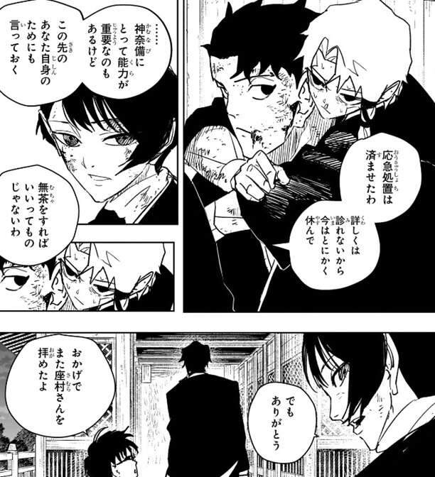 ハクリへの応急処置は済ませていますが、ハクリは神奈備にとって能力が重要でもあるけど、この先のハクリ自身の為にも無茶をすればいいってものでない、と女の巻墨がハクリに忠告します。しかし、おかげでまた座村さんを拝めたよ、とハクリにお礼も言います。その後会話をしながら歩いていると、ハクリはいつの間にか眠ってしまいます。