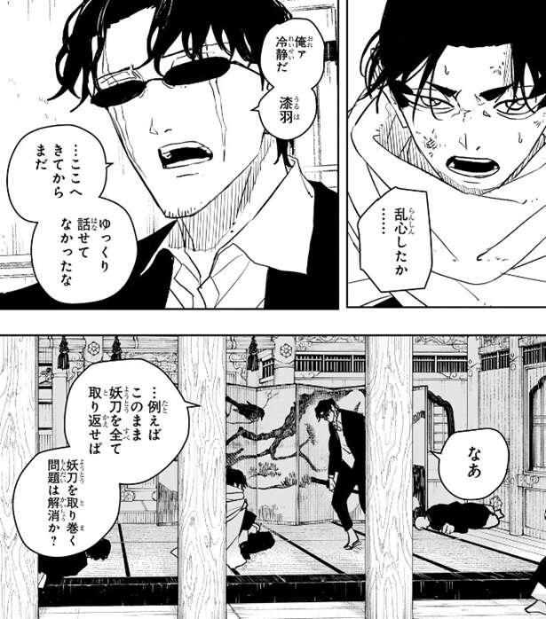 乱心したのかと問う漆羽に、冷静だと答える座村、座村はまだゆっくり話せていなかったな、と言うと、このまま妖刀を全て取り返せば妖刀を取り巻く問題は解消か?と、話し始めます。さらに座村は、そんな簡単な話なら戦後すぐに、六平国重が妖刀を隔離する必要なんてなかった、と話を続けます。