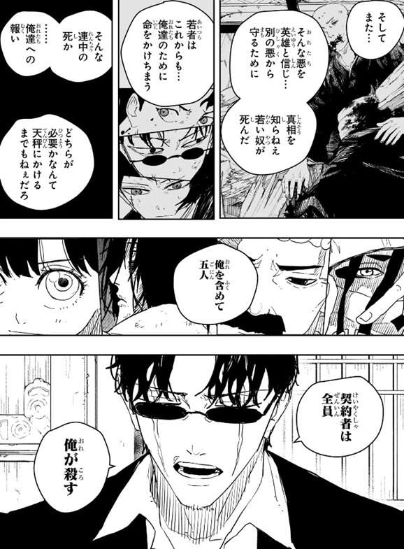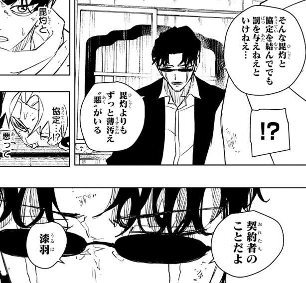毘灼は悪だと言う漆羽に、そんな毘灼と協定を結んででも罰を与えないといけない、毘灼よりもずっと薄汚い“悪”がいると座村は言いますが、毘灼と協定を結んでいると聞き漆羽とハクリは驚愕します。さらに“悪”とは契約者(おれたち)のことだよと座村は漆羽に言い、俺たちは…18年前にあの事件を隠した、と言いますが、ハクリは18年前に何があったのか分からず話についていけません。“罪”に蓋をした…、そして六平や契約者を英雄として擁立し、その上に成り立つ社会があるならと…、受け入れた、と座村は言います。