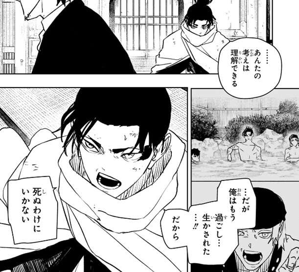 “毘灼が妖刀を使えばこの人を出し抜ける”という可能性は限りなく低い、と漆羽は考え、あんたの考えを理解できる、と漆羽は座村に言います。しかし、漆羽は慚箱・国獄で自分を守り死んでいった守護者達を思い出し、…だが俺はもう過ごし…生かされた…!!だから死ぬわけにはいかない、と座村との話し合いを止め、座村と対立することを選びます。