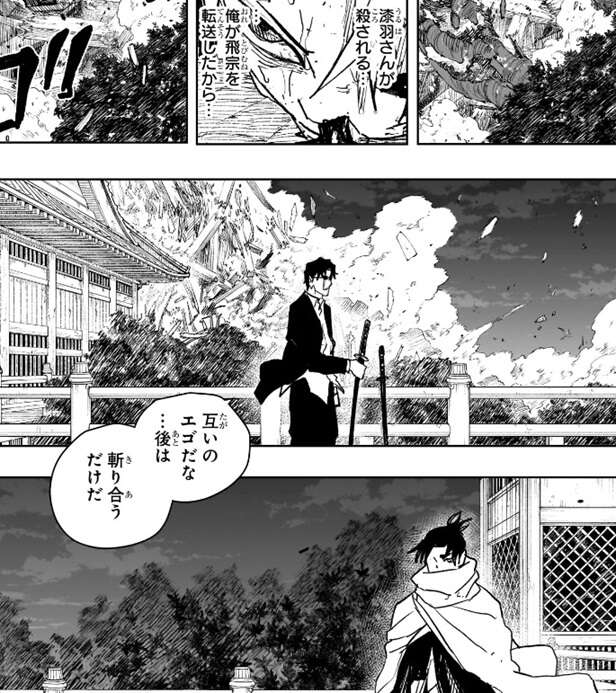 座村も互いのエゴだなと言い対立を選び、二人は斬り合う事を選びます。互いに剣を握って対峙する二人、一方ハクリは自分が飛宗を転送したからだと責任を感じ、何とか漆羽を助けようと動こうとしますが、体が動きません。