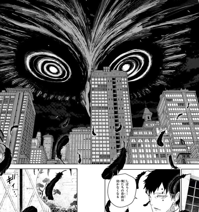 次の瞬間、座村は妖刀「飛宗」の能力、梟(フクロウ)を使用します。毘灼の統領・幽は、しばらく…俺たちの自由は効かなくなる、とつぶやきます。