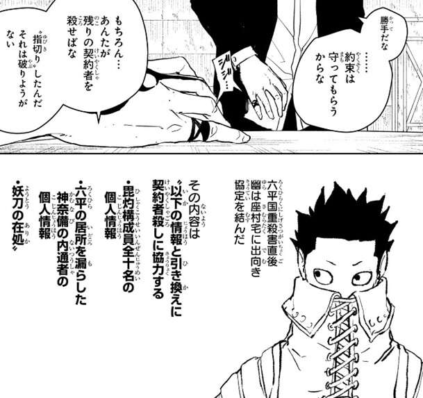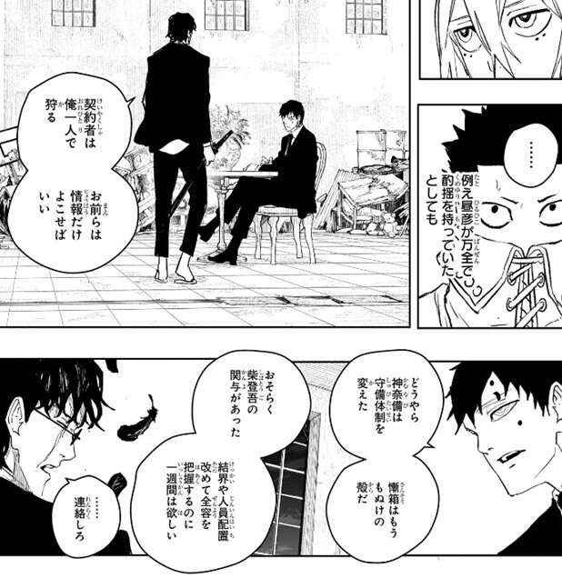 座村は毘灼の統領・幽に契約者は俺一人で狩ると言い、情報をよこすように言いますが、神奈備が守備体勢を変えたことや柴の関与があった事を理由に一週間の猶予を幽は求めます。