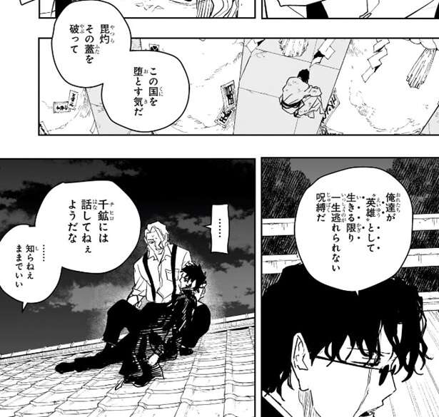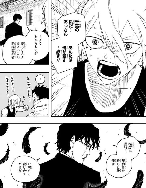 毘灼の統領・幽はチヒロを殺したことを、随分思い切りがいいな、と言い、昼彦もチヒロまで殺したのかと座村に怒ります。昼彦はチヒロの仇だと叫び、座村を殺すと宣言しますが、契約者を殺した後オレはお前らと殺し合うだけだ、とつぶやきます。座村は最終的に、契約者も毘灼も全て殺すつもりです。