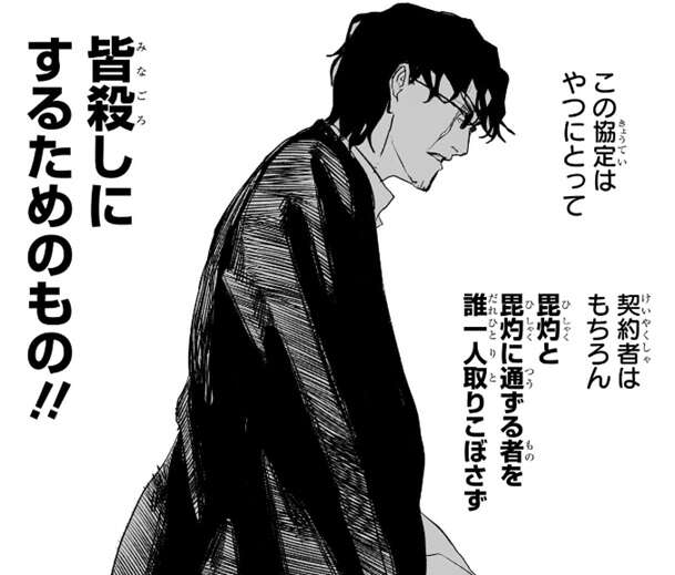 座村は毘灼と協定を結んでいるようですが、契約者はもちろん、毘灼と毘灼に通じる全員を皆殺しにするつもりです。つまり座村にとって毘灼は敵であり、妖刀「酌揺(くめゆり)」の契約者となった昼彦が殺されないのも、また別の人間に契約されるとキリがないという理由だけのようです。