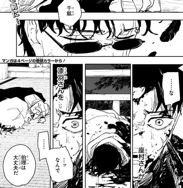 座村が漆羽を殺めた場面を見て混乱するチヒロ。しかし、座村は気にせずチヒロに話しかけます。座村はハクリは大丈夫、死んじゃいないと言いますが、チヒロの混乱は収まりません。