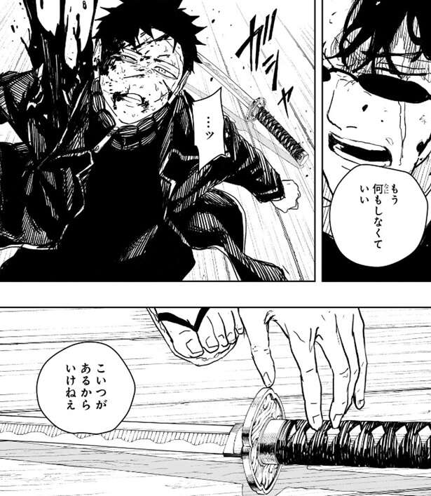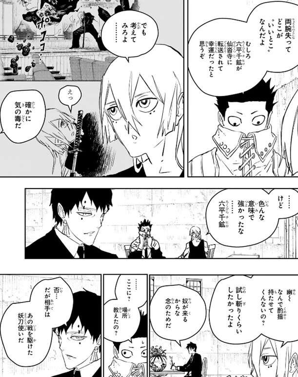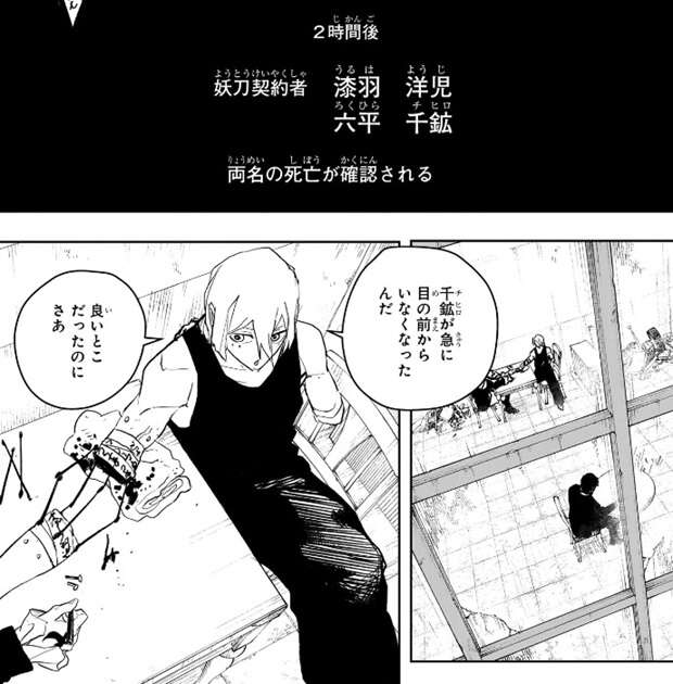 そして、2時間後に妖刀契約者・漆羽洋児と六平千鉱の死亡が確認される、とカットが入ります。場面変わって毘灼側、両腕を失った昼彦は治療を受けていますが、いい所だったのに千鉱が急にいなくなった、と文句を言っています。