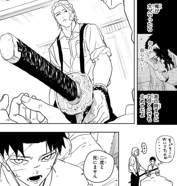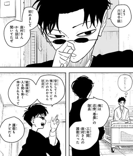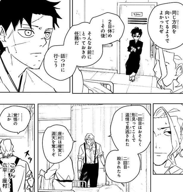 すると巻墨の隊長は、同じ方向を向いてるようでよかったぜ、と言い、二日休めと指示します。その後、チヒロにとっておきの任務を用意するようで、話しつけに行こうと言います。柴は一回目はおそらく形見という事で温情で見逃されたが、二回目は殺されたら座村は確実に淵天を奪うぞ、と言いますが、覚悟の上か、とつぶやきます。